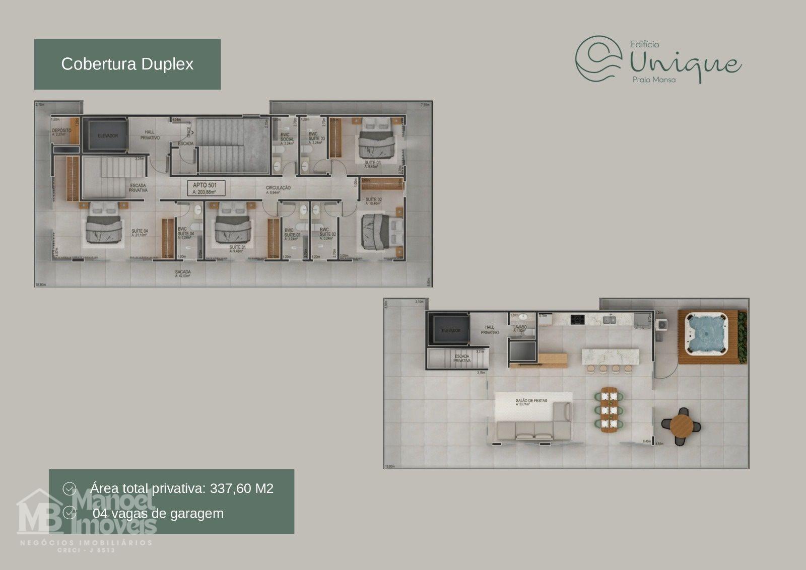 Cobertura Duplex 3 suítes área privativa 203,88m² e área total de 337,60m²